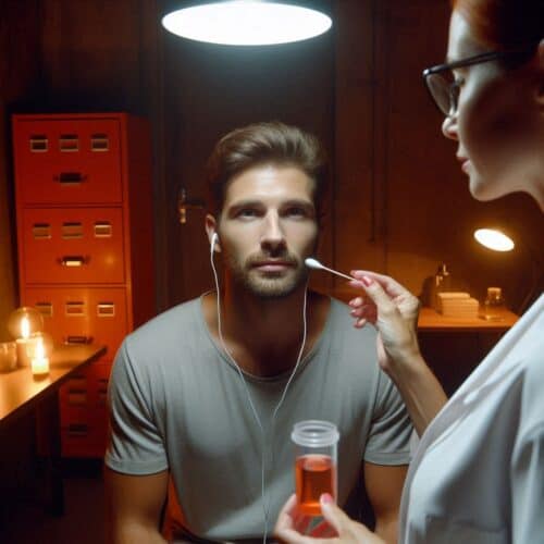 A continuación Luciana le ofrece un platillo con tres hisopos. Él fue pasando por sus orificios nasales cada uno de ellos. Parece que duda entre el primero y el segundo, cogidos ambos con los dedos índice y pulgar de cada mano. En un momento dado respira hondo y se recuesta sobre el alto respaldo de su asiento, muy apropiado para esa postura.